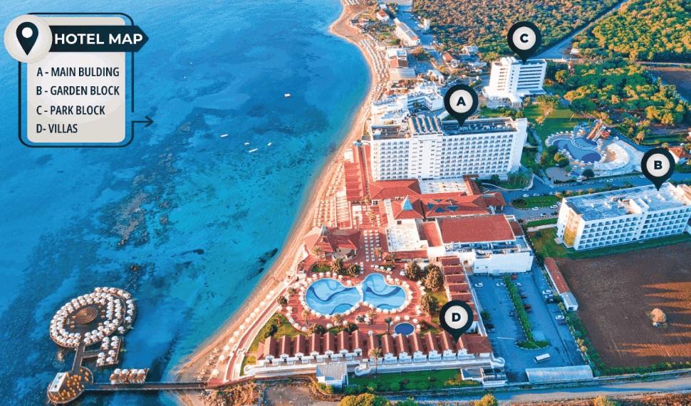 Ellátás: ultra all inclusive ellátás, benne: svédasztalos reggeli (07:00-10:00), késői reggeli (10:00-11:00), svédasztalos ebéd (12:30-14:30), svédasztalos vacsora (19:00-21:30), éjjeli snack vacsora (23:00-02:00), napközben snack ételek és jégkrémek a Beach étteremnél (12:00-16:00), török édességek és sütemények (12:00-16:00). Korlátlan és térítésmentes italfogyasztás az összes étteremben illetve az Aquapark (10:00-18:00); Lobbi (08:00-00:00); Pool (10:00-00:00); Saluna (10:00-18:00), Beach (10:00-17:00) bárokban és az éjszakai szórakozóhelyen is (23:00-02:00). Az italválaszték a szálloda által meghatározott helyi és ismert márkás (import) alkoholos és üdítőitalokra, teára, gépi kávéra és török kávéra szól, azonban az a palackozott italokra és a frissen facsart narancslére és főzött kávékra nem vonatkozik. Térítésmentes a sportpályák, a fitneszterem, törökfürdő, pezsgőfürdő, szauna, gőzfürdő, asztalitenisz, sakk és darts használata. Térítés ellenében: teniszoktatás, búvároktatás, sporteszközbérlés, strandon privát pavilonbérlés, biliárd, játék automaták, masszázs és Spa szolgáltatások használata.